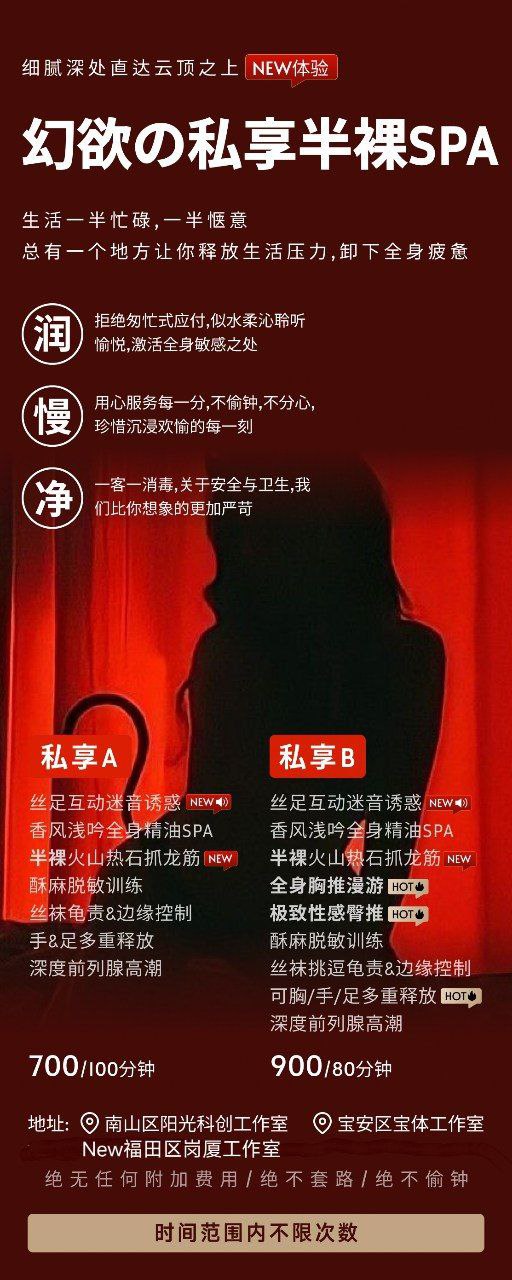 服务项目:時間內手法做滿,不偷鐘純口碑,不做快餐,注重體驗感,頂級SPA +熱石專業龍筋 時間內無限次釋放:胸推,臀療,龜頭責邊緣控制,強制高潮,脫敏療法,三起三落,體驗不一樣的爽感,頭皮酥麻求饒的感覺,反覆高潮,長達5-10分鐘。